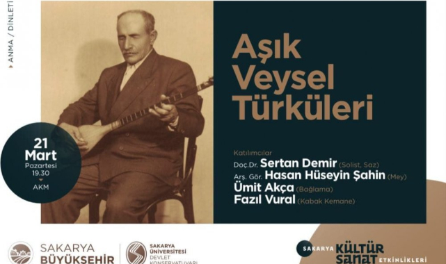 Sakarya Büyükşehir Belediyesi Kültür Sanat Etkinlikleri, alanında usta isimlerin katıldığı birbirinden değerli programlara ev sahipliği yapmaya devam ediyor. 21 Mart Pazartesi günü gerçekleştirilecek ‘Aşık Veysel Türküleri’ adlı programda Türkiye’nin usta ismi Aşık Veysel eserleriyle hatırlanacak. Anma ve dinleti programında sazda Doç. Dr. Sertan Demir, meyde Arş. Gör. Hasan Hüseyin Şahin, bağlamada Ümit Akça, kabak kemanede ise Fazıl Vural yer alacak. AKM’de gerçekleştirilecek etkinlik saat 19.30’da başlayacak. Kıymetli eserlerin seslendirileceği programa tüm vatandaşlar davet edildi.