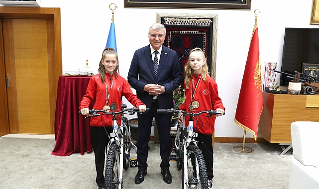 Balkan Şampiyonasında birincilik ve üçüncülük elde eden Yağmur Şevval Dursun ve Elif Burukoğlu’na Başkan Yüce bisiklet hediye etti.