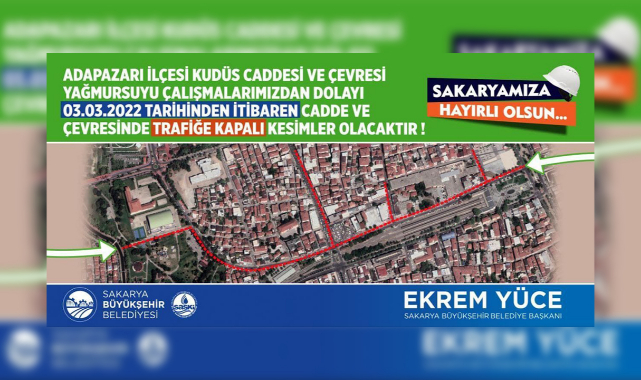 Konuyla ilgili SASKİ’den yapılan açıklamada, “Adapazarı Kudüs Yağmursuyu İnşaatı kapsamında Aziz Duran Parkı içerisinde tamamladığımız birinci etaptan sonra ikinci etap için çalışmalara başlanacaktır. Kent merkezindeki ulaşımın ana damarı niteliğindeki caddeleri kapsayan çalışmanın ikinci etabı kapsamında Kudüs Caddesi’nin Çark Caddesi girişinden Gökçe Sokak’a kadar uzanan bölümü geçici olarak trafiğe kapatılacaktır. Vatandaşlarımız 14 Nisan tarihinden itibaren alternatif güzergâhları kullanmaları gerekmektedir” denildi.