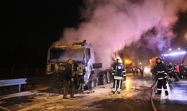Yangın, Kuzey Marmara Otoyolu (KMO) Sakarya geçişi Karaman mevkiinde meydana geldi. Edinilen bilgiye göre, İstanbul’dan Kahramanmaraş Pazarcık’a doğru seyir halinde olan çekici plakalı 41 BJ 018 plakalı Aydın Şen idaresindeki iş makinası yüklü tır henüz bilinmeyen bir sebepten dolayı alev aldı. Dumanları fark ederek aracı emniyet şeridine çeken sürücü durumu 112 Acil Çağrı Merkezine bildirdi. Konunun haber verilmesi üzerine bölgeye Jandarma Otoyol Trafik ve itfaiye ekipleri sevk edildi. Adrese ulaşan ekipler tırın alev alan çekici kısmına müdahale etti. İtfaiyenin müdahalesi neticesinde yangın, uzun uğraşlar neticesinde kontrol altına alınarak söndürüldü. Tırın çekici kısmı tamamen yanarak kullanılamaz hale gelirken, konuya ilişkin inceleme başlatıldı.