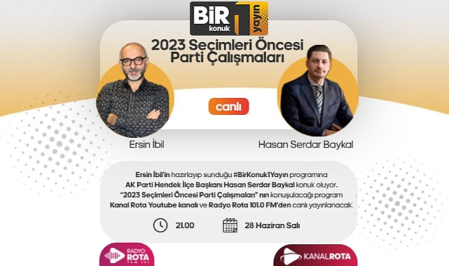 Ersin İbil’in hazırlayıp sunduğu #BirKonuk1Yayın programının bu haftaki konuğu AK Parti Hendek İlçe Başkanı Hasan Serdar Baykal oluyor. 2023 seçimleri öncesi parti çalışmalarının konuşulacağı program, 28 Haziran Salı günü saat 21’de Kanal Rota YouTube ve Radyo Rota’da canlı yayınlanacak.