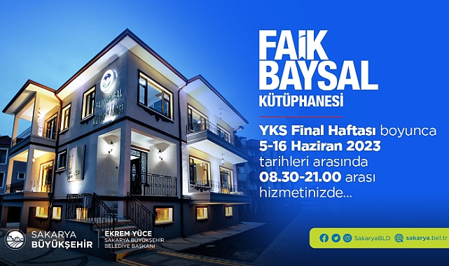 Sakarya Büyükşehir Belediyesi Faik Baysal Kütüphanesi, YKS final haftası boyunca öğrencilere daha verimli bir çalışma alanı sunacak. Konu ile ilgili bir yapılan açıklamada, “Faik Baysal Kütüphanemiz, YKS final haftası boyunca öğrencilere hizmet verecektir. Öğrencilere daha verimli bir çalışma ortamı sağlamak amacıyla gerçekleştirilen çalışmada, 5-16 Haziran tarihleri arasında saat 08.30’dan gece 21.00’a kadar kütüphanemizin kapıları açık kalacaktır. Büyükşehir Belediyesi olarak YKS sınavlarına hazırlanan tüm öğrencilerimize başarılar diliyor ve kütüphanemize bekliyoruz” ifadeleri kullanıldı.