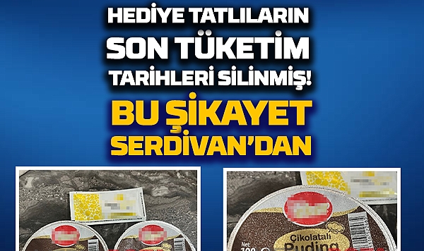 Serdivan İlçesinde faaliyet gösteren bir işletmeden yemek söyleyen aile, yemeklerinin yanında hediye olarak gönderilen tatlıların paketleri üzerinde son tüketim tarihi olmadığını fark etti. Paketleri inceleyen aile üyeleri, son tüketim tarihlerinin paket üzerinden silindiğini iddia ederek durumu sosyal medyada paylaştı. Sosyal medyada paylaşılan fotoğraflarda; paketli tatlıların kapak kısımlarının belirli noktalarında deformasyon olduğu görülürken paylaşımın ardından firma tarafından bir açıklama yapılmadı.DAHA ÖNCEDE ŞİKAYET EDİLMİŞ
