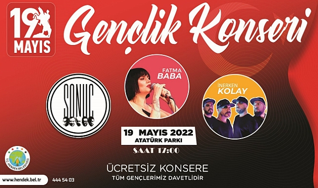 Hendek Belediyesi 19 Mayıs Atatürk’ü Anma Gençlik ve Spor Bayramı münasebetiyle bir dizi etkinlikler ve ‘Gençlik Konseri’ düzenliyor. Gençlerin konser taleplerine kayıtsız kalmayan Başkan Turgut Babaoğlu, gençlerin beklediği müjdeyi resmi sosyal medya hesaplarından duyurdu. Babaoğlu yaptığı paylaşımda, “Sevgili gençler; Beklediğiniz güzel bir haberi, yeni haftanın ilk gününde sizlerle paylaşmak istiyorum.19 Mayıs Atatürk’ü Anma Gençlik ve Spor Bayramı vesilesiyle Perşembe günü Atatürk Parkı içinde saat 17.00'da sevdiğiniz isimler Fatma Baba, Sonuç ve İnerken Kolay sahne alacak. Haydi, bayram günü sizin için hazırlanan Gençlik Konserine hepinizi bekliyoruz “ diye yazdı.