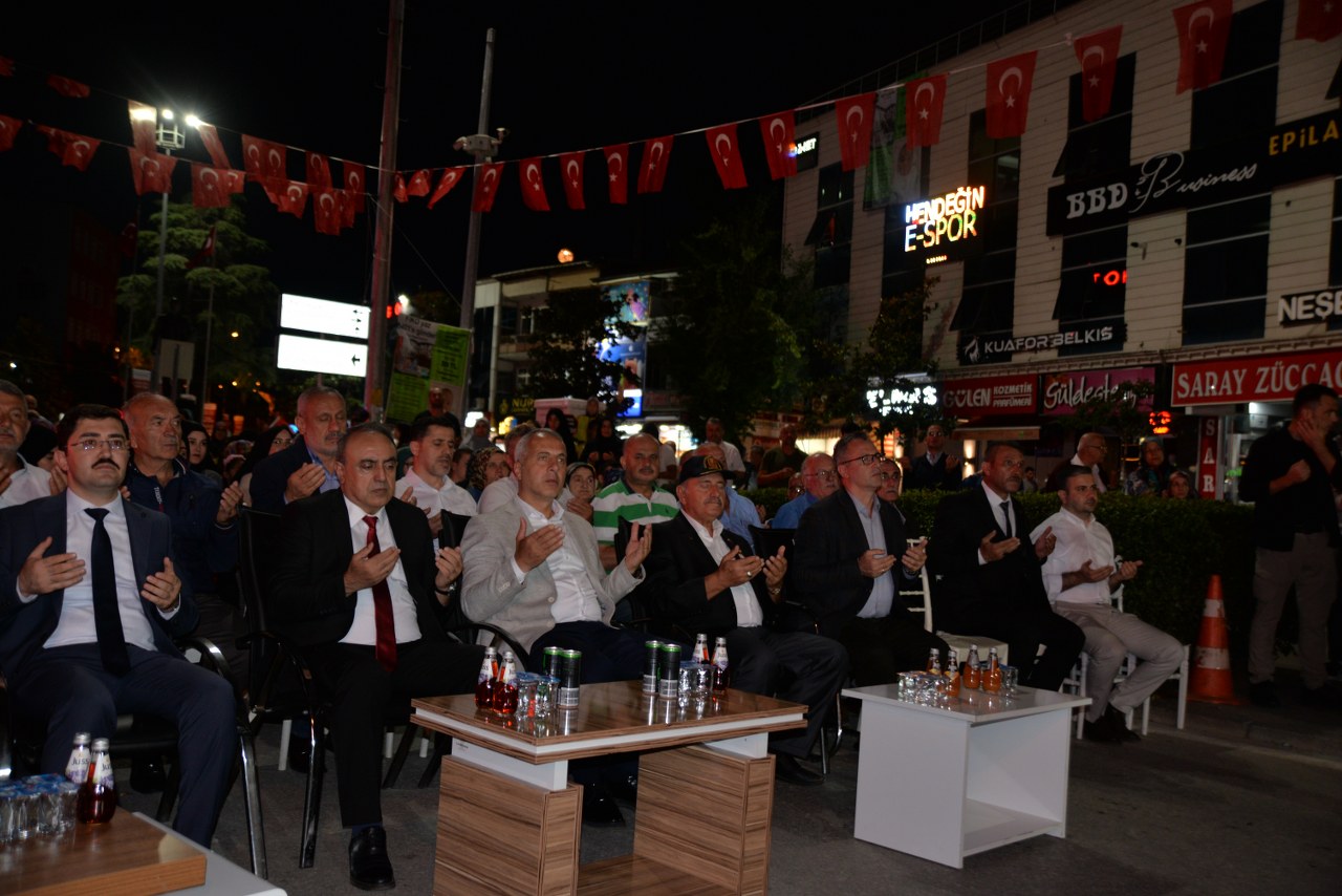 Etkinliklerde ilk olarak Kuran-ı Kerim tilaveti yapıldı. Ardından Hendek Müftüsü Mürteza Gür tarafından aziz şehitlerimiz için dua okutuldu. Coşkunun hiç eksik olmadığı meydana ilk olarak hitap eden Hendek Belediye Başkanı Turgut Babaoğlu, “Hendek her zaman olduğu yine çok güzel. Bu anlamlı geceye katılan herkese çok teşekkür ediyorum. Bundan 10 sene önce biri bize 15 Temmuz gibi gece yaşayacağımızı söylese, darbe kalkışması olacağını söylese her halde o günler eskide kaldı derdik. Ama maalesef yaşadık. Videoları izledik bir kez daha. Gerçekten çok acı. Bizim için kutsal gördüğümüz Ordumuzun içine sızan kalleşler; birliğimizi, kardeşliğimize ve ülke yönetime kast edip bu vatanın evlatlarına suikast düzenlediler. Allah bu millete böyle bir şey yaşatmasın. Bu meydanlara bakınca hainlerin emellerine ulaşamayacağını bir kez daha görüyoruz. Allah’ın izniyle Türkiye Cumhuriyeti ilelebet var olacaktır. Türk milleti ve devleti hiçbir zaman yenilmeyecektir. Tüm Aziz Şehitlerimizi ve Gazilerimizi şükranla anıyorum” dedi