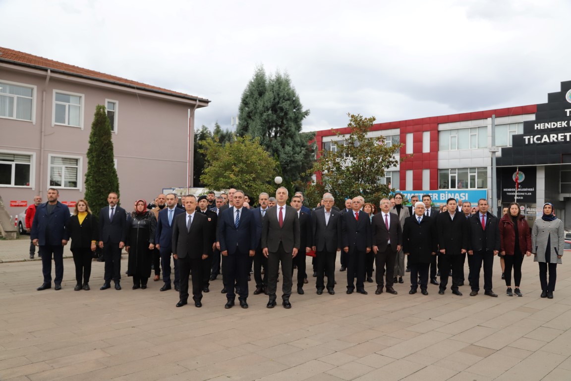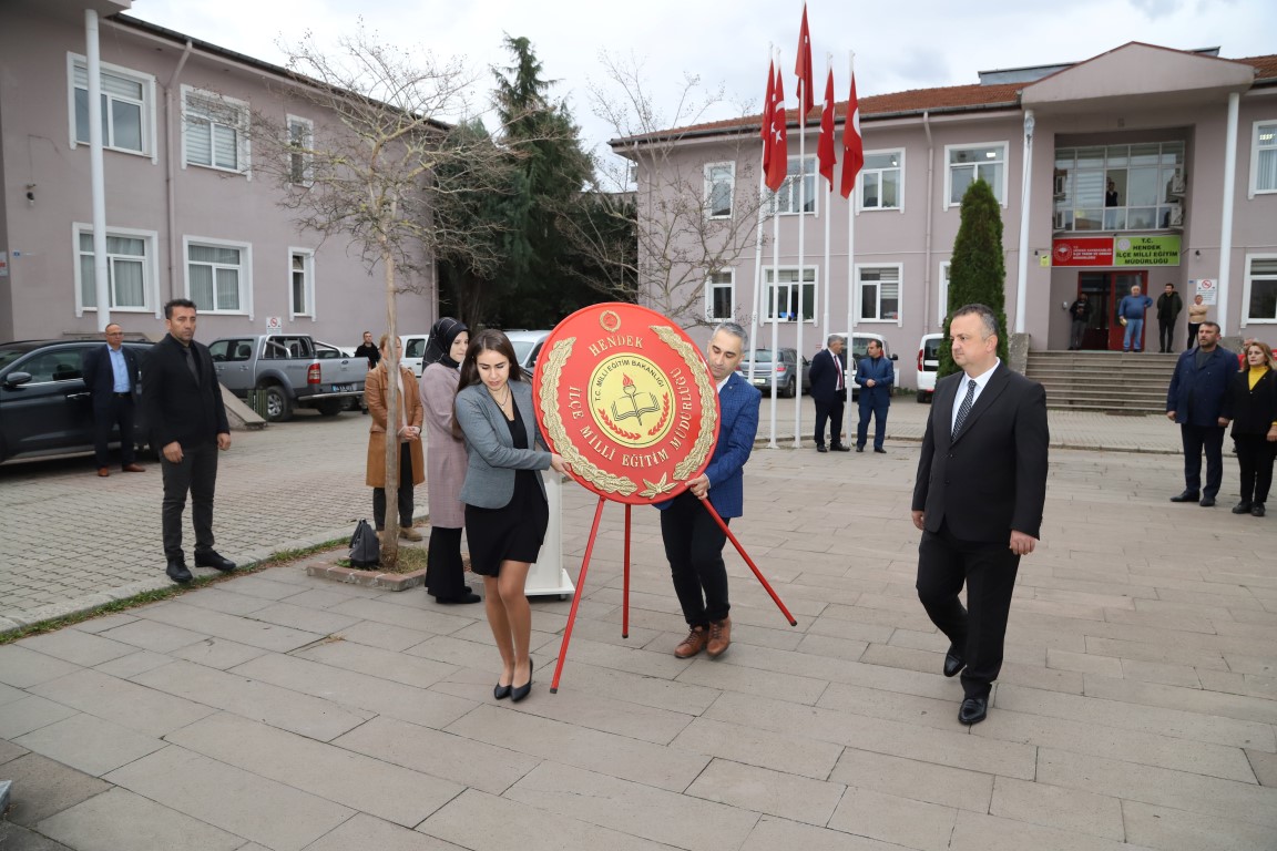 Hendek Kaymakamlığı önünde düzenlenen törene Hendek Kaymakamı Halil İbrahim Acır, Hendek Belediye Başkanı Turgut Babaoğlu, Hendek İlçe Emniyet Müdürü Mesut Eyigün, Hendek İlçe Milli Eğitim Müdürü Murat Çekikçioğlu, Siyasi partilerin ilçe temsilcileri, sivil toplum kuruluşları temsilcileri, öğretmen ve öğrenciler katıldı. Hendek Kaymakamlığı önünde bulunan Atatürk Anıtı’na Hendek İlçe Milli Eğitim Müdürü Murat Çekiçcioğlu tarafından çelenk sunuldu. Saygı duruşu ve İstiklal Marşı’nın okunmasıyla başlayan etkinlik daha sonra Hendek Ticaret Merkezi Konferans salonunda devam etti.