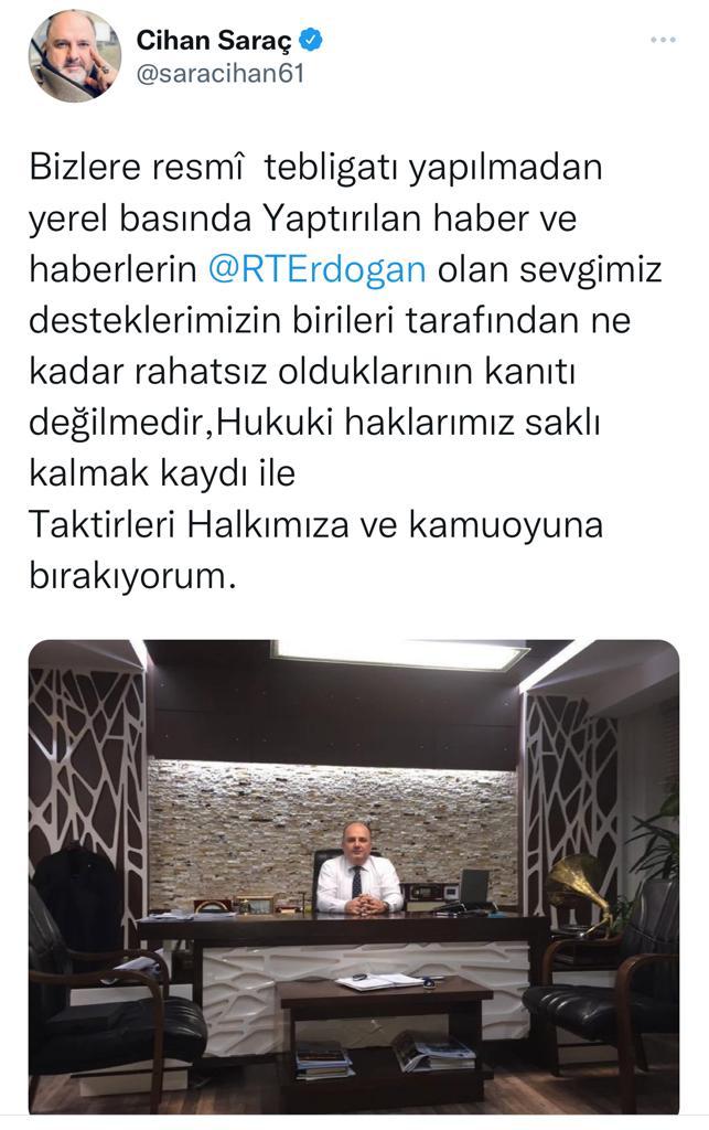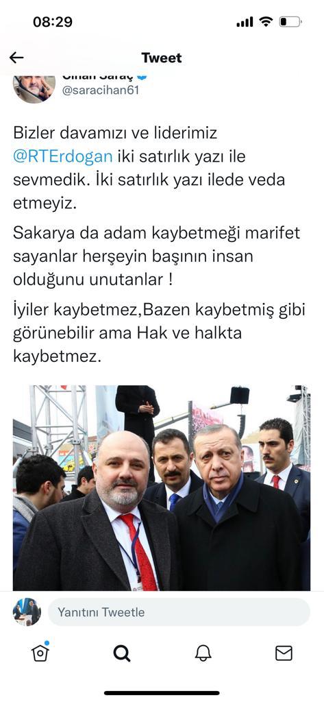 Seçim dönemlerinde piyasaya çıkarak aday adayı olmasıyla bilinen AK Parti Sakarya teşkilat üyesi Cihan Saraç son yaptıklarıyla bardağı taşırdı. Cihan Saraç hakkında hazırlanan dosyanın Ankara’ya gönderilen dosyası sonuçlandı. Cihan Saraç, AK Parti’den ihraç edildi.PES DEDİRTTİHiçbir ticari faaliyet göstermemesine rağmen kamuoyuna iş adamı ve hatta eşinin doktor olmasını öne çıkararak kendisini tanıtan Cihan Saraç'ın birçok vukuatının olduğu konuşuluyordu. İl dışına gittiği tatilden dönerken bozulan aracının yerine bölgede kendisini Milletvekili adayı olarak tanıtıp ilçe başkanının aracını alarak şehre döndüğü, bu durumdan doğan maddi zararı ise uzun bir süre ödemediği iddia edilmişti. Son olarak birçok siyasetçi tarafından engellendiği sosyal medya hesabından yaptığı paylaşımları bardağı taşırdı. Tüm bunlara rağmen hakkında hazırlanan dosyanın Ankara’ya gönderilmesiyle birlikte, “Reis beni ihraç etmez” şeklinde ifadeler kullanan Cihan Saraç AK Parti’den ihraç edildi. Öte yandan Cihan Saraç dosyasının Ankara’ya gönderildiği haberini yapan haber sitemizin sosyal medya hesaplarını ve Genel Yayın Yönetmenimiz Ersin İbil’i sosyal medyadan engellemişti.