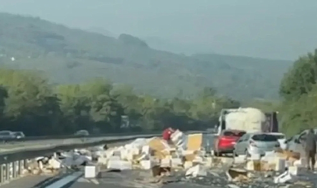 Anadolu Otoyolu Düzce kesiminde tır aracı bariyerlere çarparak dorsesinde bulunan turşular yola savruldu. Yol yaklaşık 1 saat trafiğe kapalı kaldı.