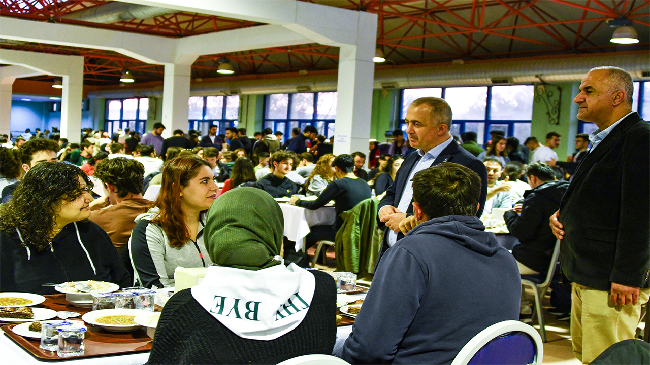 İftar öncesi masaları dolaşarak öğrencilerle sohbet eden Rektör Savaşan, “Ramazan Ayının manevi iklimini hissettiğimiz bu güzel günlerde sizlerle aynı sofrada iftar yapmaktan mutluluk duyuyorum. Her fırsatta siz değerli öğrencilerle bir araya gelmeye gayret gösteriyoruz. Özellikle evlerinizden uzakta geçirdiğiniz Ramazan ayında sizleri yalnız bırakmamak için elimizden gelen tüm çabayı sarf ediyoruz.” diye konuştu.