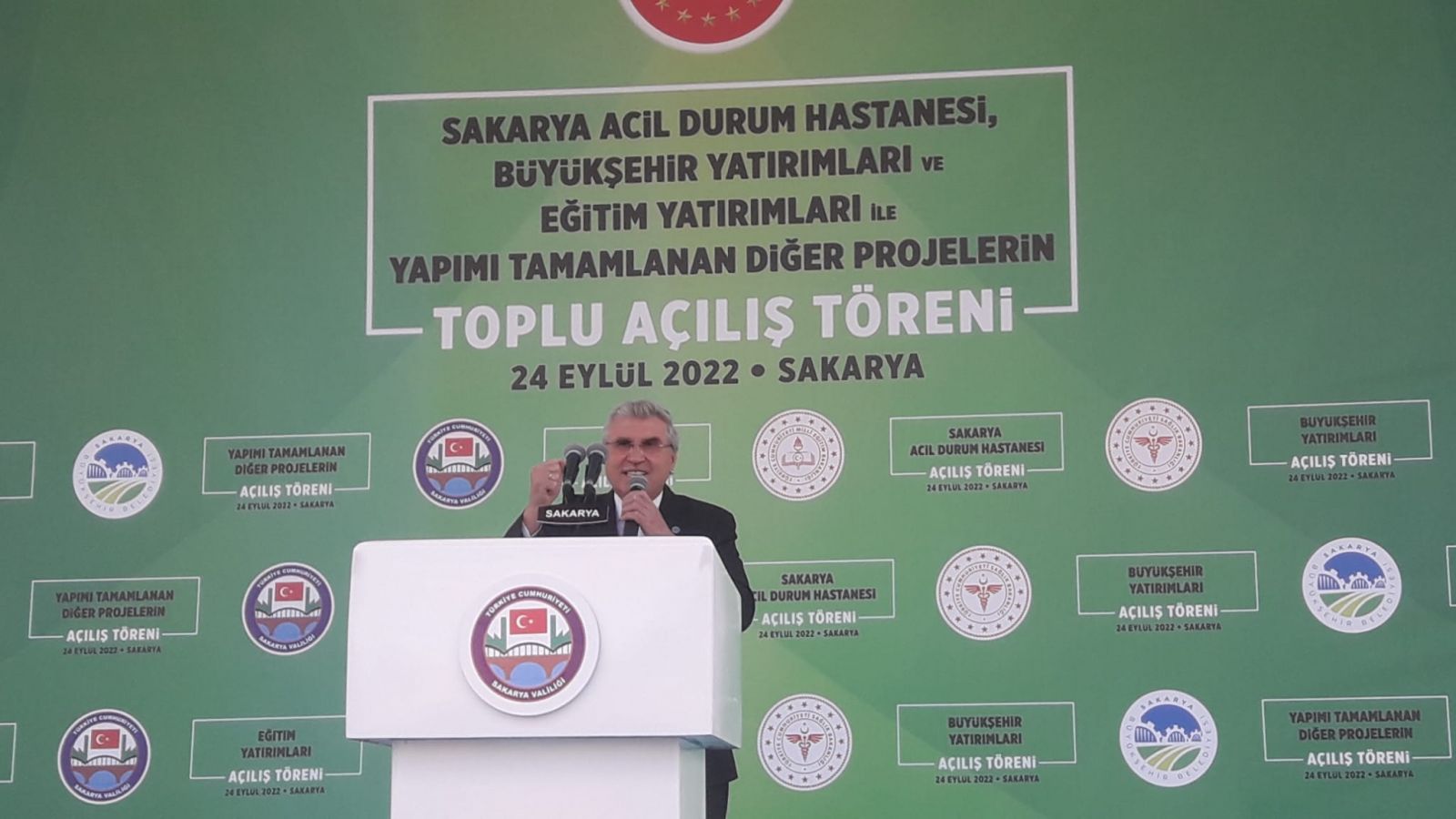 Açılış töreninde Sakaryalılara seslenen Cumhurbaşkanı Erdogan: " Sevgili Sakaryalılar 14 aylık hasretin ardından sizlerle birlikte olmanın mutluluğunu yaşıyorum. Sakarya bugün coşkulu. Masum çocuğu saf anadolunun. Yol onun varlık onun gerisi angarya yüzüstü çok süründün ayağa kalk Sakarya. Ben Sakarya'yı ayağa kalkmış olarak gördüm. Uzun yolculuktan geldim özbekistan sonra New York'da dünya liderleriyle arka arkaya görüşme yaptık. Hamdolsun hepsinden gerek milletimizle, gerek konuşmamızla ilgili hep teşekkür aldık. Bu milletin bir evladı bu milletin bir ferdi olarak yürüdük. Yaptığımız bütün görüşmelerden ülkemize selamlar var. Afrika'da Türkiye var, arakanda Türkiye var. Ezelden beri Sakarya bizi bilir,bizde Sakarya'yı biliriz. Sakarya'yı bilmeyenler Sakarya Meydan Savaşı'nın Sakarya da yapıldığını söylüyor. Düşünebiliyor musunuz; benim ülkem bunların eline kalırsa vay haline. Çok çalışacağız. Sakarya'yı bilmeyenler şu meydanın altındaki otoparka, otopark yapacağını söylüyor. Sakarya Meydan Muharrebesi'nin 100 yılını geçenlerde geride bıraktık. Bu vatan uğrunda hayatını kaybedenleri rahmetle anıyorum. Bunlar şehit nedir bilmez, şüheda nedir bilmez. Bay kemal bunları bilemez, ama alışacak. Adapazarı bölgesi ermeni ve rumlara karşı destansı bir mücadele vermiştir ve düşmanı bu topraklardan atmıştır. Sakarya'ya kazandırdığımız eser ve hizmetleri biliyorsunuz. Sakarya'ya 4 milyar liralik degeri bulunan 203 tesisin açılışını gerceklestireceğiz. SAÜ ve SUBÜ'nün tamamlanan birimlerin açılışını buradan yapıyoruz. Sağlık da 250 milyon liralik sağlık yatırımları, ulaştırmada 60 km'lik Karasu, Kaynarca'nın yüzde 49'luk kısmını bugün açıyoruz. Bu yol sayesinde 70 dakika yol 40 dakikaya inecek. Akaryakıtta da büyük bir indirim olacak. Enerjide çok sayıda yapılan trafo açılışında bugun yapıyoruz. Kanalizasyon içmesuyu mahalle çalışmaları, Arifiye, Pamukova tren yolunda gerçekleştirilen projeleri açıyoruz. SBB 725 milyon liralik yatirimi Sakarya'ya kazandırdı. Adapazarı, Serdivan, Erenler, Arifiye, Pamukova, Akyazı ve belediyelerimle pek çok yapılan yatırımları hizmetine sundu. Şehrimize hayırlı olsun. Sakarya'mıza bu hizmetleri gerçekleştirilen belediyeleri, bağlantılarımızı tebrik ediyorum. Sakarya’mıza kazandırdığımız hizmetler son 29 yılda 42 milyar liralik yatırım yaptık. Eğitimde destek Genclik ve Spor'da yüksek öğrenim binaları açtık. Sosyal yardımlarda Sakaryalı vatandaşlarımıza 3 milyar, sağlıkta 57 adet hizmet binasını sehrimize kazandırdık. Çevre ve Şehircilikte TOKİ ile 7 bin 300 konut inşaatını yaptık. Depreme hazırlıkta kentsel dönüm çalışması yapıyoruz. Eski stadın yerini Millet Bahçesi olarak düzenledik. Ulaştırmada 401 km yol hizmete açtık. Çok sayıda yol projesinde hizmete başlayacağız" dedi.