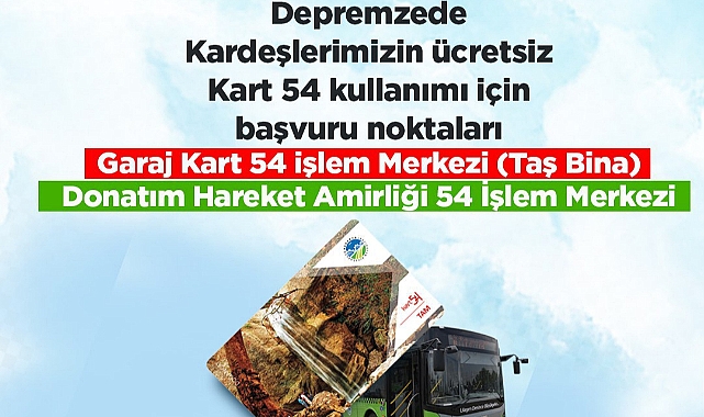 Büyükşehir Belediyesi Türkiye’yi sarsan deprem felaketinin ardından Sakarya’ya gelen depremzedelere ücretsiz ulaşım hizmeti sunacak. Kart54 merkezlerine yapılacak başvuruların ardından Sakarya’nın misafirleri ulaşımdan ücretsiz bir şekilde faydalanacak.
