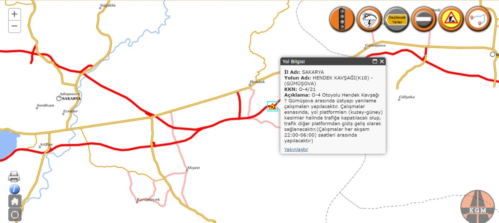 Anadolu Otoyolu Hendek ile Gümüşova gişeleri arası, üst yapı yenileme çalışmaları sebebiyle saat 22.00-06.00 saatlerinde ulaşıma kapalı olacak. Konuya ilişkin Sakarya Valiliğinden yapılan açıklamada, Karayolları 1. Bölge Müdürlüğünce Hendek-Gümüşova gişeleri arasında üst yapı yenileme çalışmaları yapılacağı belirtildi. İstanbul istikametinde çalışmalara başlanacağı belirtilen açıklamada, “Trafik diğer platformdan gidiş geliş olarak sağlanacaktır. İstanbul istikametinde çalışmalar tamamlanınca Ankara yönü kesimler halinde trafiğe kapatılacak olup İstanbul istikametinden gidiş geliş olarak sağlanacaktır. Çalışmalar 11 Mayıs Çarşamba günü saat 22.00'de başlayacaktır. Her akşam 22.00-06.00 saatleri arasında çalışma yapılacaktır. Sürücülerin yol üzerindeki trafik işaret ve işaretçilerine titizlikle uymaları önemle rica olunur. Sürücülerin yol üzerindeki trafik işaret ve işaretçilerine titizlikle uymaları önemle rica olunur” denildi.